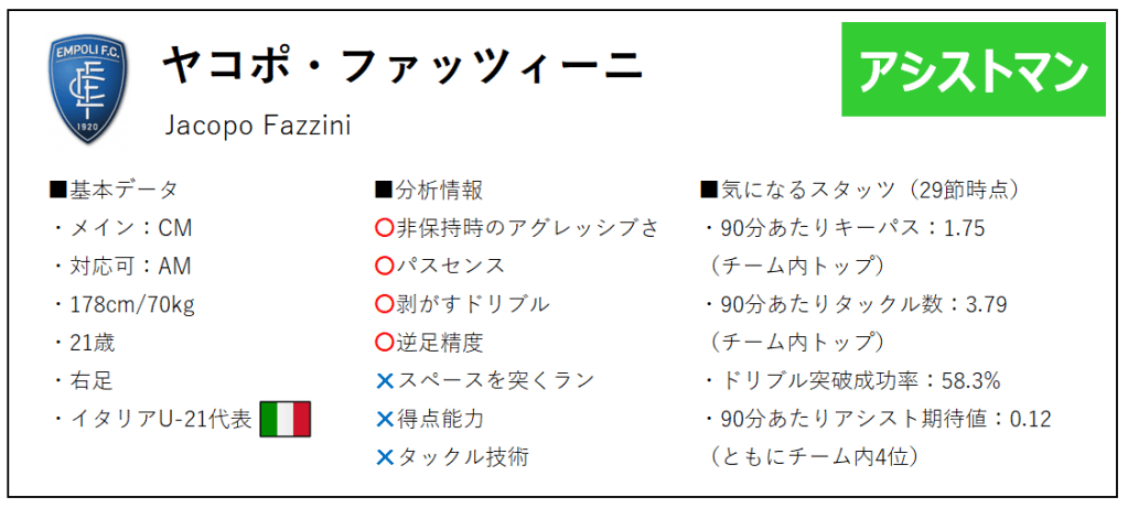 こうして相手をかわした後のパスセンスも持ち合わせている。積極的にラストパスを狙っていくのがファッツィーニの特長で、ゆえにパス成功率は低いがキーパスも多くなっている。 1枚剥がして運び、ラストパスを供給するというのがファッツィーニが得意とする一連のプレーの流れだ。